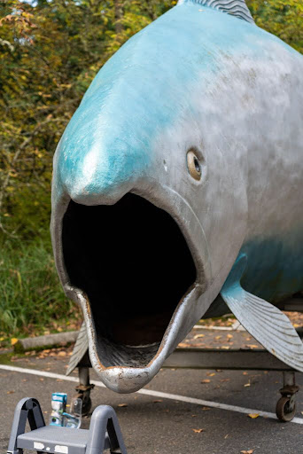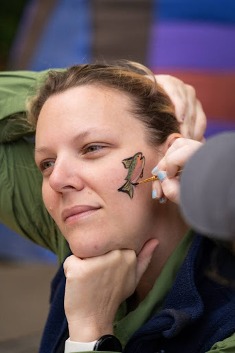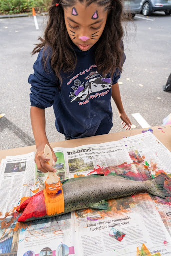 As families crowd around arts and craft booths painting colorful wooden salmon, children go from timid youths to impassioned artists before your very eyes. Nearby young couples paint real salmon to then print on posters or t-shirts that will carry the memories of the day for years to come. Not far from these painters, but still in the midst of “Critter Corridor” other attendees engage in animated discussions with local non-profits while marveling at bear furs, survival crafts, and of course FIN the 25-foot giant wild salmon! It’s these connections to our local environmental community that make the day such an impactful celebration and help visitors continue to explore the watershed throughout every season of the year.